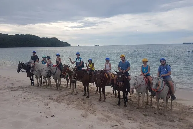 O passeio inclui um trajeto tranquilo a cavalo e tempo na praia; a duração exata não é especificada, mas espere várias horas incluindo o transfer.