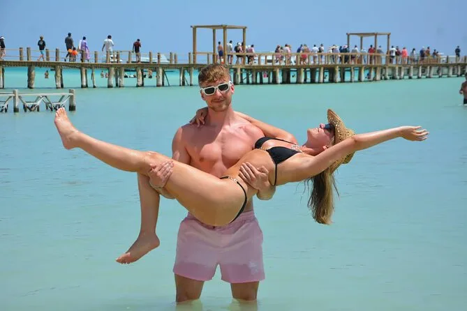 Fazer snorkel em Hula Hula foi como entrar em outro mundo — corais por toda parte, pequenos flashes de laranja e azul passando rápido. Ahmed apontou um peixe-papagaio comendo o recife; tentou me ensinar o nome em árabe, mas confesso que esqueci logo depois. Tivemos tempo para flutuar ou caminhar pela beira da água — alguém achou uma estrelinha do mar minúscula e todo mundo se aglomerou em volta, feito criança. Depois voltamos para o barco para mais sol (e talvez refrigerantes demais), seguindo para Orange Bay. É engraçado — chamam de “as Maldivas de Hurghada”, mas o lugar tem seu próprio charme: aqueles balanços de madeira na água rasa, música vindo de algum lugar atrás das palmeiras, vozes ecoando na areia.