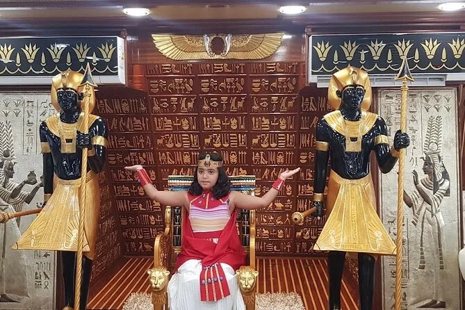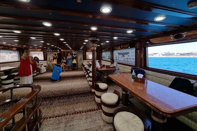 O barco é decorado como uma réplica do túmulo da rainha Nefertari, com interiores temáticos e um deck de observação submarino.
