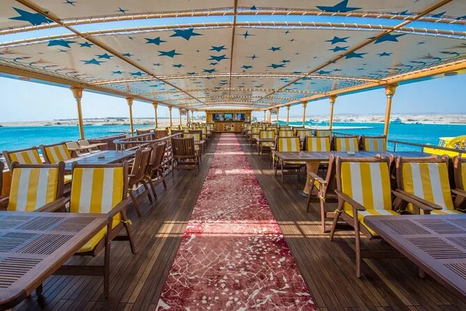 Seu dia inclui traslado do hotel em Marsa Alam em veículo com ar-condicionado, todas as taxas e entradas já pagas para evitar qualquer dor de cabeça, guias locais experientes tanto no deck quanto na água para ajudar no snorkel nos recifes da Baía das Tartarugas, além de um almoço ou jantar completo de 3 pratos com frutos do mar a bordo (com opções veganas e sem glúten se solicitado), tudo isso antes de voltar confortável após sua aventura no Mar Vermelho.