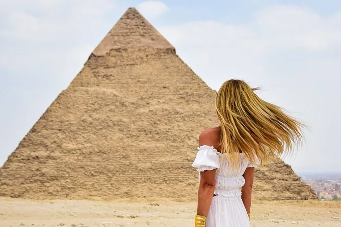 Seu dia inclui traslado cedo no hotel em Hurghada, voos domésticos ida e volta entre Hurghada e Cairo, todos os traslados em veículos com ar-condicionado, entradas conforme sua opção de reserva, visitas guiadas com um egiptólogo pelos principais pontos do Cairo, além de almoço em restaurante local antes do voo de volta à noite.