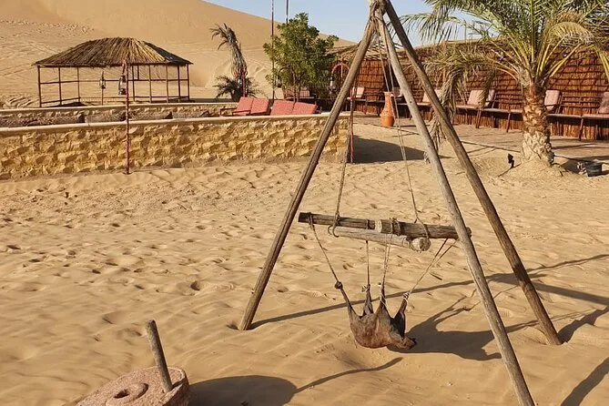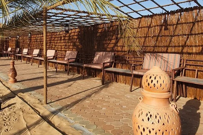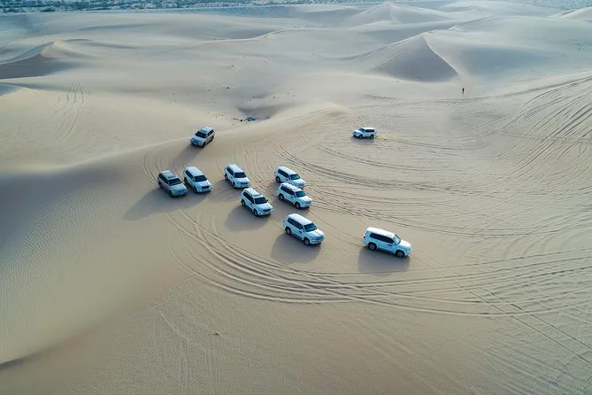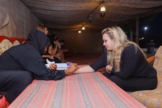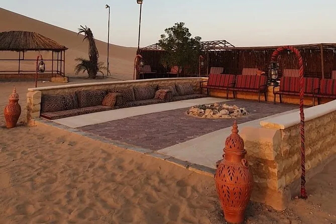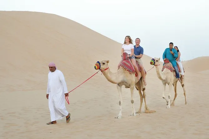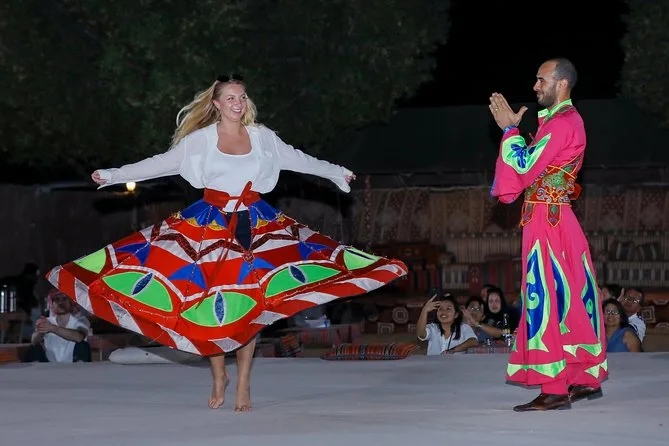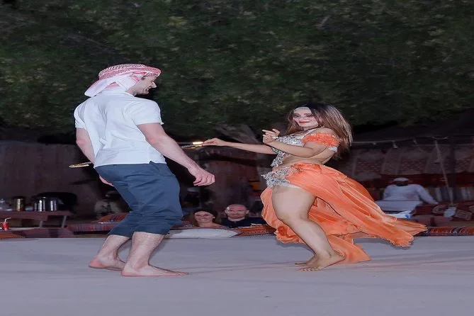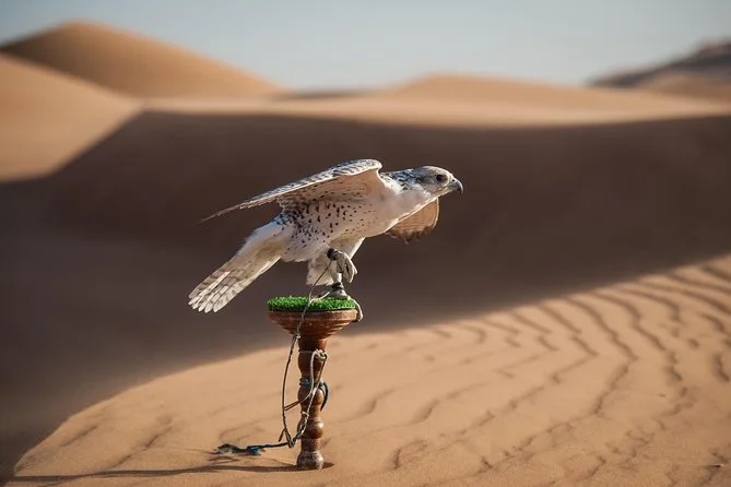 Dune bashing, passeio curto de camelo para fotos, sandboard, pintura de henna, narguilé, fotos com falcão, shows de dança Tanoura e dança do ventre.
