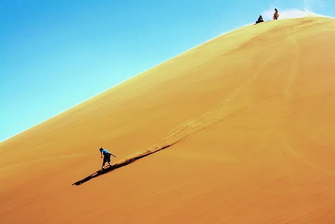 Paramos em uma fazenda de camelos — eles pareciam meio entediados, meio curiosos. Um chegou perto da minha manga e bufou (acho que gostou de mim). O Yasin distribuiu as pranchas de sandboard; deslizar não é nada parecido com neve — é mais devagar, com areia solta, mas surpreendentemente divertido. Caí duas vezes e ganhei aplausos de uma criança ali perto. O sol já começava a se pôr, pintando tudo de um laranja suave que até meu cabelo bagunçado parecia mágico nas fotos.