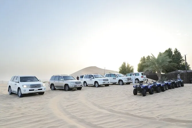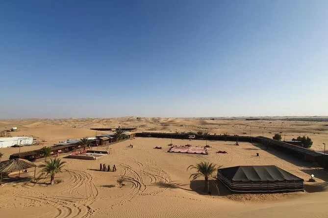 Sua tarde começa com o transporte em 4x4 com ar-condicionado, saindo do seu hotel ou ponto escolhido em Abu Dhabi. Você visitará uma fazenda de camelos antes de seguir para as dunas para o dune bashing guiado e sandboard. Ao pôr do sol, chega a um acampamento tradicional onde pode saborear café e tâmaras na chegada; experimentar pintura de henna ou narguilé; tirar fotos com um falcão; assistir apresentações de dança Tanoura e dança do ventre; aproveitar um jantar BBQ com refrigerantes; e depois retornar ao hotel sob um céu estrelado.