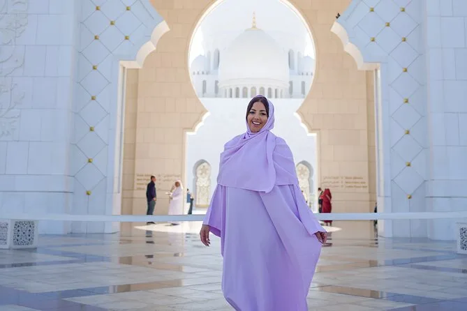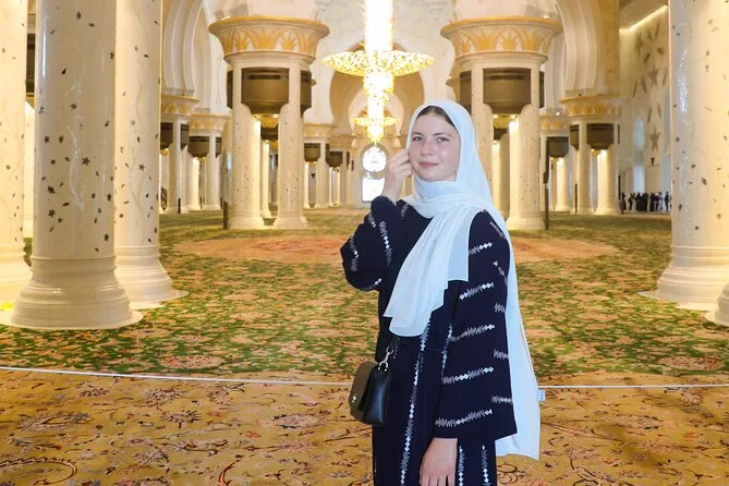 Mulheres devem usar roupas longas e soltas que cubram braços, pernas e cabeça; roupas transparentes não são permitidas dentro da mesquita.