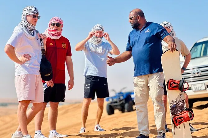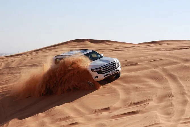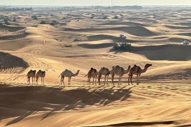 O seu dia inclui transfer gratuito de ida e volta do hotel dentro de Dubai em veículo 4x4, aventura nas dunas vermelhas com guia em inglês, passeio rápido de camelo (eles têm muita personalidade), diversão no sandboard nas dunas macias, água para se manter hidratado, além de opções de quadriciclo ou jantar com churrasco ao vivo se selecionado na reserva.