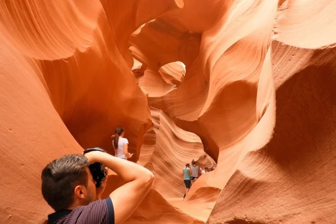 Descendo aquelas escadas de metal para dentro do slot canyon, parecia que eu estava entrando em outro mundo — o ar fresco tocando meus braços depois de horas na van. As paredes se torcem de um jeito que só faz sentido quando você está dentro delas. Marcus apontava formas nas pedras (“aquela parece uma águia”, disse ele; eu vi mais um coelho) e ensinava palavras Navajo para as cores — tentei repetir uma e ele só sorriu, nem se preocupou em corrigir. Éramos umas dez pessoas no grupo, e em um momento todo mundo ficou em silêncio quando um raio de luz cortou o canyon — deu arrepios de verdade.