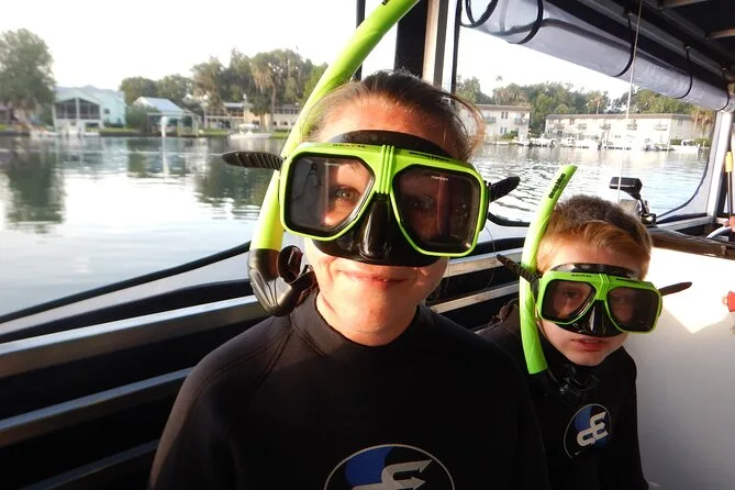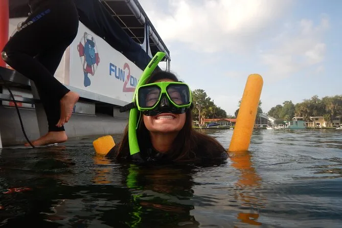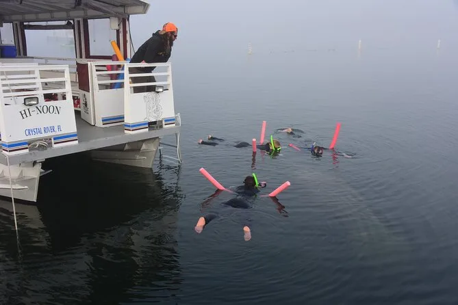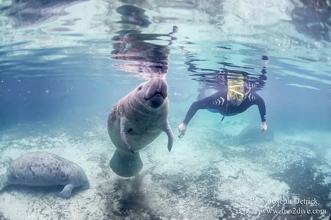 Seu dia inclui estacionamento gratuito na estrutura do centro de Crystal River, todo o equipamento de snorkel (máscara, snorkel, roupa de neoprene), um passeio de barco panorâmico até as nascentes com grupos de até seis pessoas, além de um capitão local experiente e um guia na água que também tira fotos durante seu encontro com os peixes-boi selvagens.