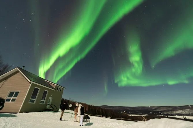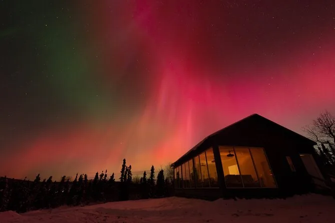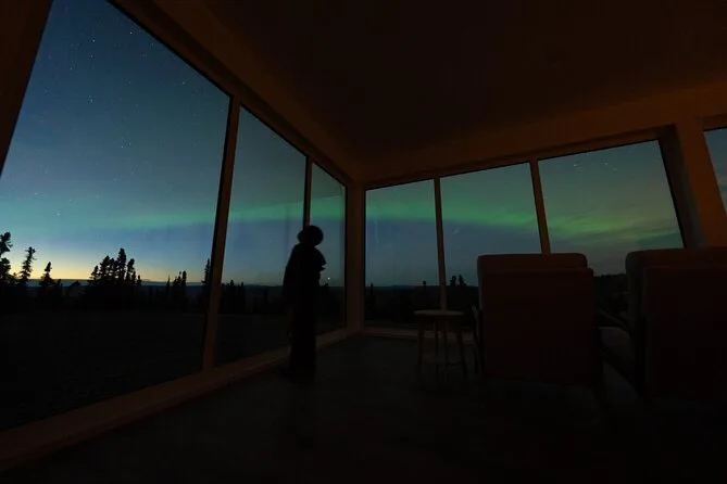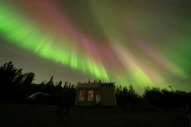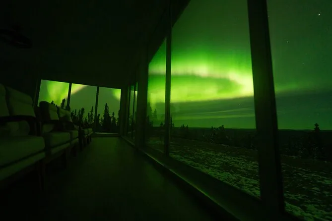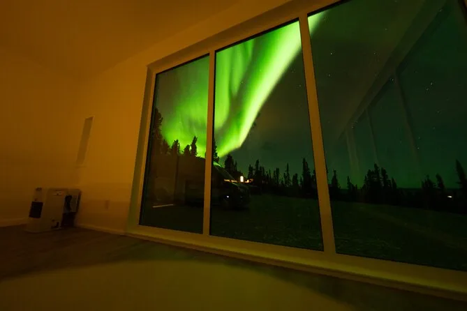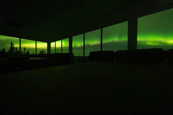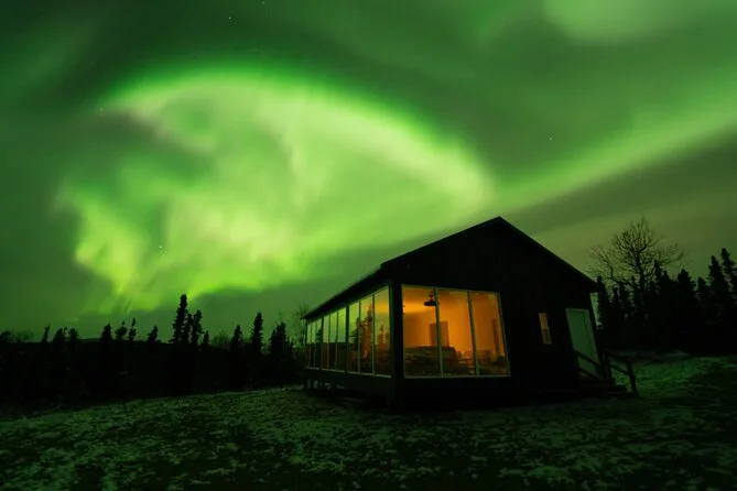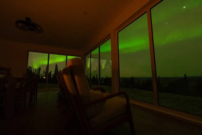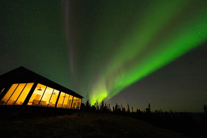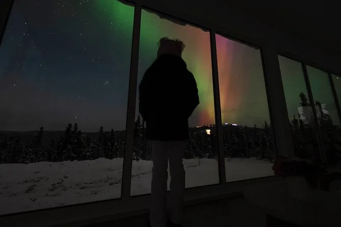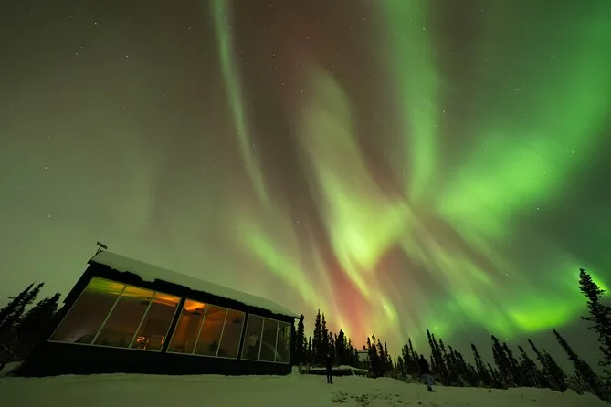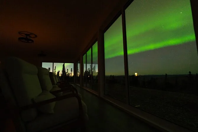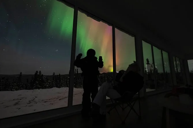 Sua noite inclui transfer guiado até a Casa de Vidro com vista 270° no Cleary Summit, perto de Fairbanks, acesso à cabana aconchegante com janelas do chão ao teto para observação, lanches e bebidas quentes como chocolate e café enquanto espera as luzes, água engarrafada se quiser, e ajuda para fotos da aurora para você não se preocupar com a câmera.