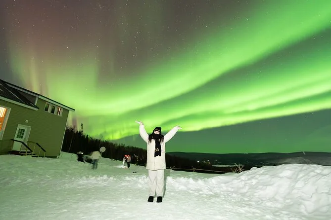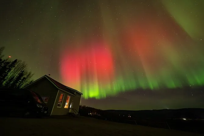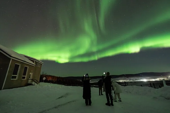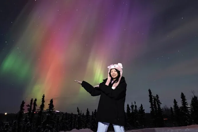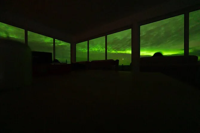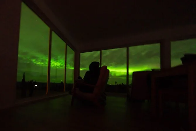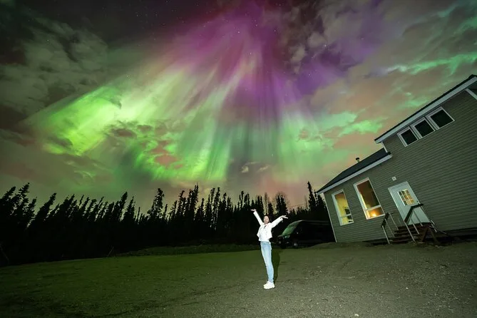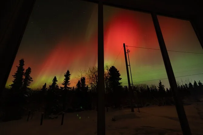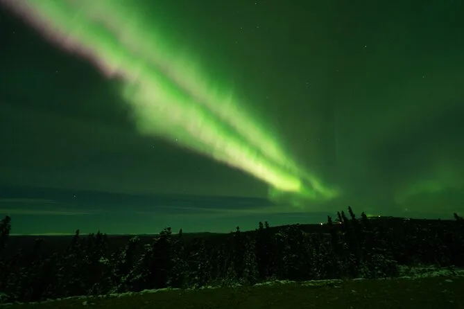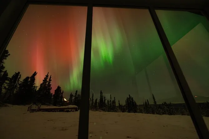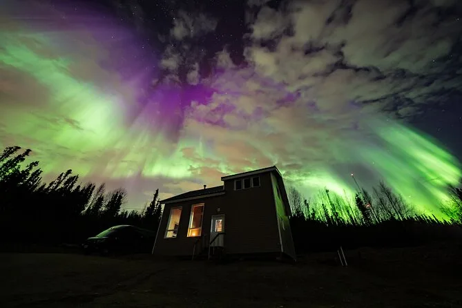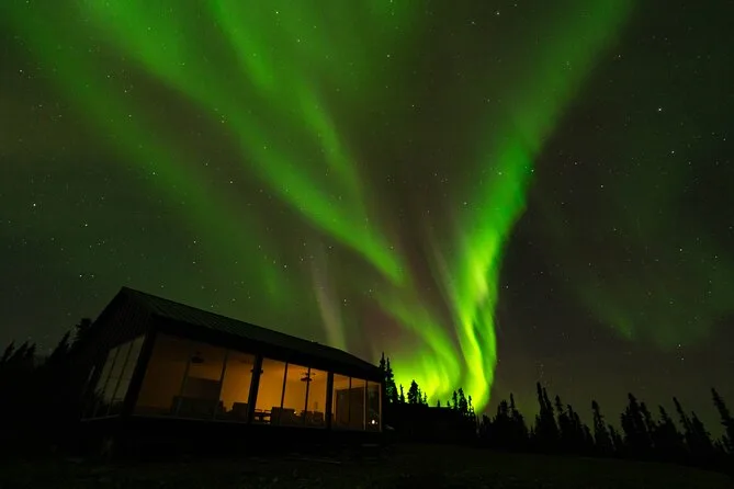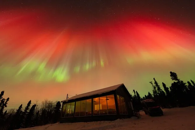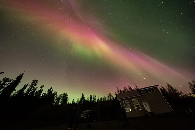Sua noite inclui transfer guiado até a Casa de Vidro com vista 270° no Cleary Summit, perto de Fairbanks, acesso à cabana aconchegante com janelas do chão ao teto para observação, lanches e bebidas quentes como chocolate e café enquanto espera as luzes, água engarrafada se quiser, e ajuda para fotos da aurora para você não se preocupar com a câmera.