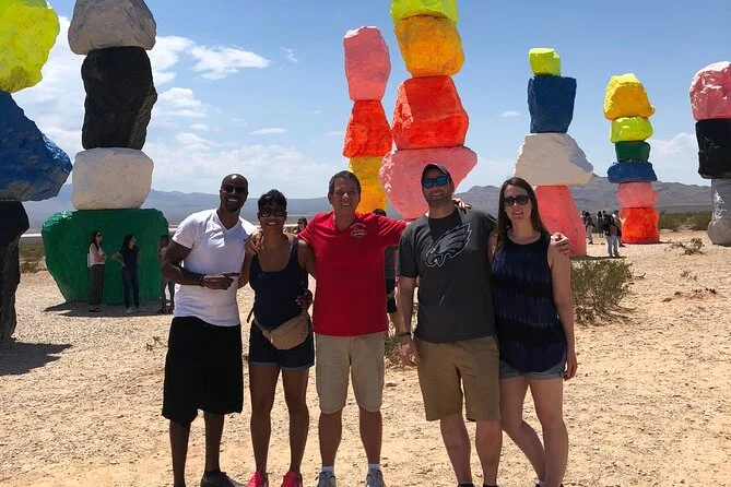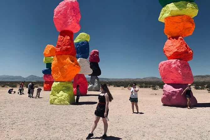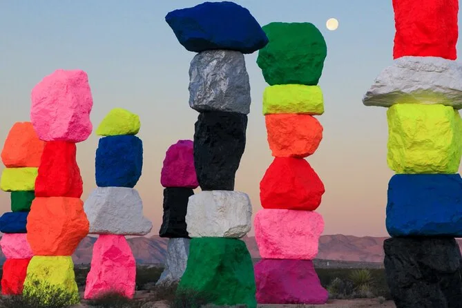 É uma instalação de arte ao ar livre criada por Ugo Rondinone, com pedras coloridas empilhadas no deserto Mojave — uma parada opcional para fotos.