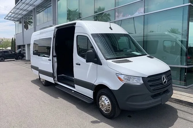Usamos vans Mercedes Benz personalizadas com teto alto e 14 assentos para garantir conforto.