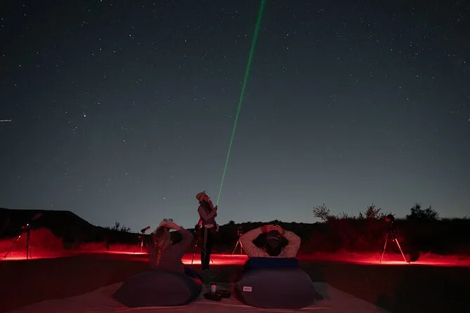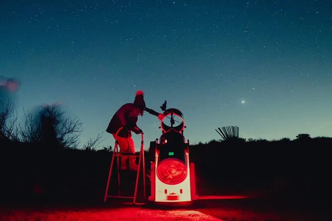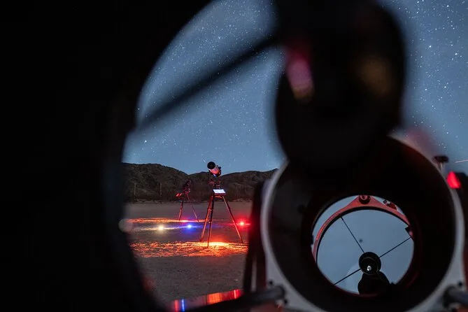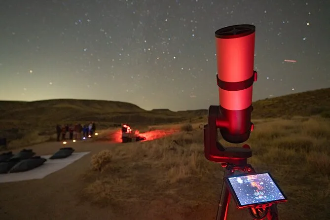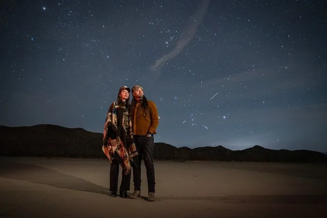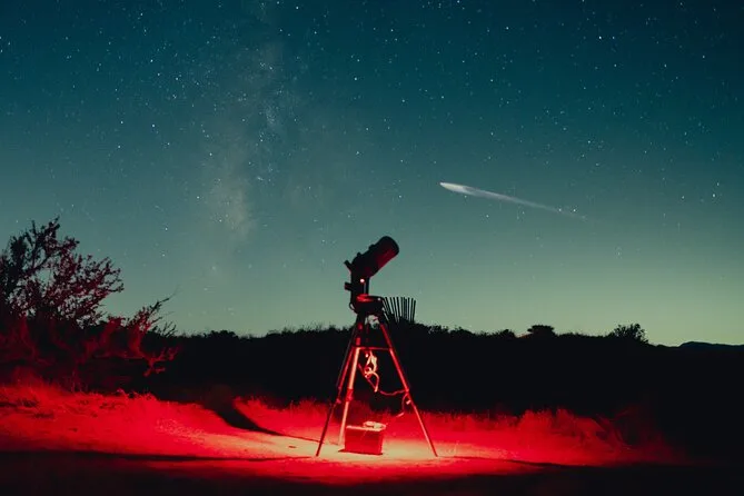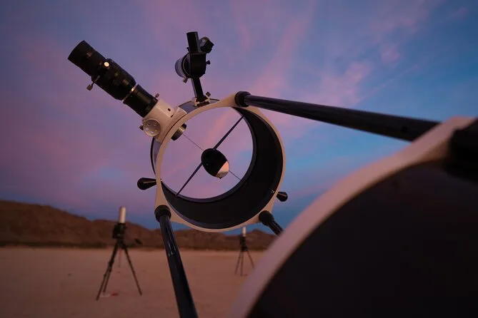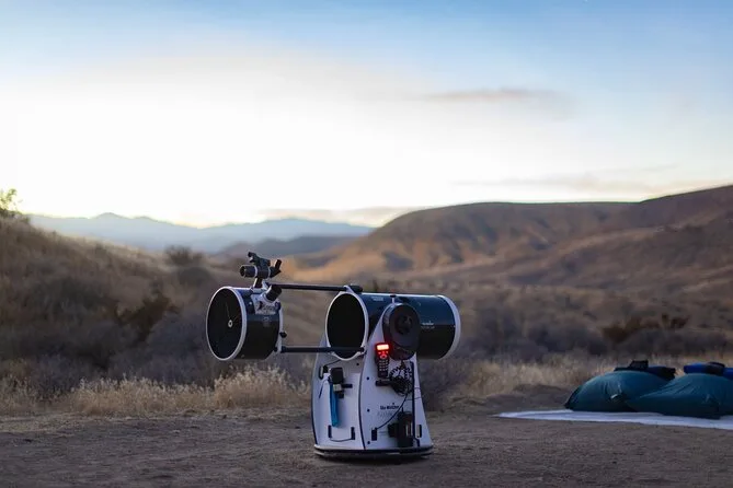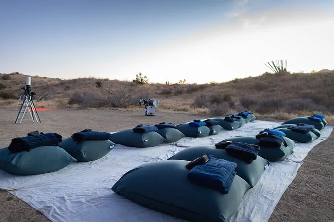 Sua noite inclui tempo prático com telescópios controlados por teclado e binóculos astronômicos guiados por um astrônomo, cadeiras Yogibo super confortáveis que facilitam deitar, cobertores macios para se proteger do frio do deserto, além de bebidas quentes ilimitadas como café e chocolate enquanto você ouve histórias das constelações sob o famoso céu escuro de Joshua Tree.