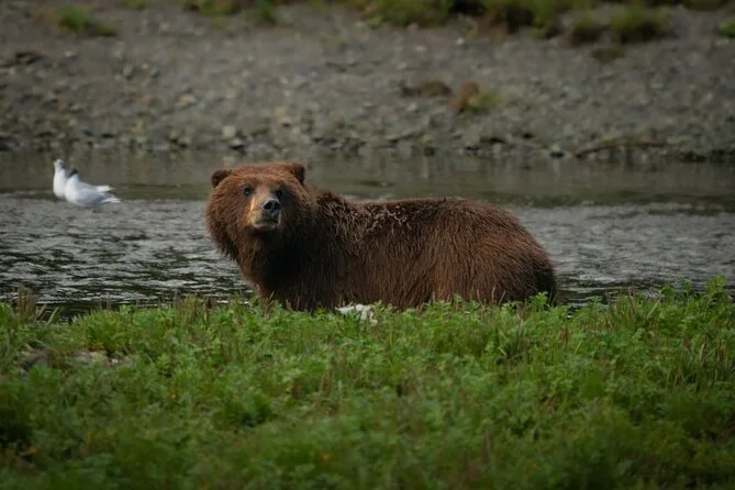Seu dia inclui transporte de ida e volta de Juneau por van e hidroavião, todas as taxas do Parque Nacional, guias locais certificados durante toda a visita, além de equipamentos contra chuva (jaquetas e botas de borracha) no seu tamanho, se precisar. O almoço com lanches reforçados e água é oferecido antes do retorno à tarde — tudo organizado para você focar em observar os ursos pardos, sem preocupações.