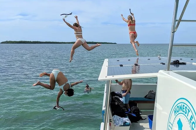 Seu dia inclui encontro com o capitão no catamarã SQUID na marina de Key West (reserve tempo extra para estacionamento), todo o equipamento de snorkel fornecido a bordo, água servida em garrafas de aço reutilizáveis, lanches orgânicos fresquinhos de um café local entre as atividades, banheiro a bordo e grupos pequenos com guias treinados por biólogos da Honest Eco — assim você é cuidado tanto acima quanto abaixo da água.