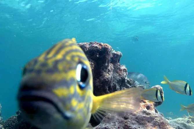 Depois do caiaque, navegamos mais para longe para fazer snorkel perto do Sand Key Reef — Nick conferiu a visibilidade antes de escolher o ponto, o que gostei porque não sou nenhum Jacques Cousteau. A água estava fresca, mas nada gelada quando entrei. Ele mostrou um peixe snapper de cauda amarela passando rápido por baixo do coral e uma esponja que esqueci o nome na hora (desculpa, Nick). Flutuar ali com a luz do sol dançando na água parecia meio mágico... até a máscara de alguém embaçar e todo mundo ter que ajudar a arrumar. Isso me trouxe de volta para a realidade — de um jeito bom.
