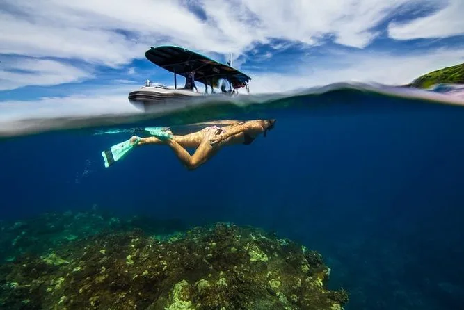 Seu dia inclui lugar num barco coberto navegando pela costa sul de Kona com todo o equipamento de snorkel fornecido (máscaras, nadadeiras e coletes flutuadores higienizados), água mineral para se manter hidratado, frutas frescas para o lanche e sua escolha de sanduíche para o almoço — basta avisar se prefere peru, atum, presunto, rosbife ou vegetariano no momento da reserva.