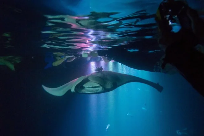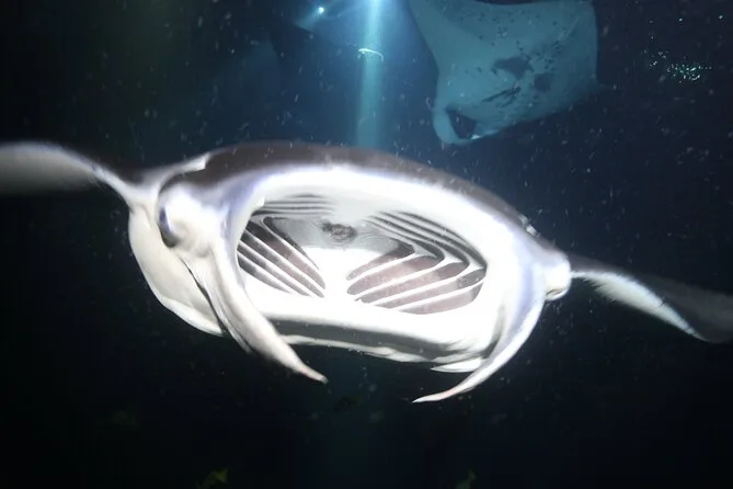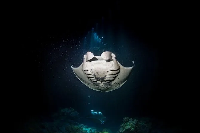 Quando ancoramos, distribuíram as roupas de neoprene e o equipamento de snorkel (a minha ficou um pouco apertada, mas confesso que gostei do calorzinho). A equipe preparou umas luzes de mergulho super fortes que cortavam a água escura — de repente, dava para ver um monte de plâncton girando ao redor. Entramos na água e ficamos flutuando sobre as luzes, segurando umas pranchas de espuma. No começo parecia estranho — como se estivéssemos suspensos no espaço — até que alguém deu um suspiro e apontou para baixo. Uma sombra enorme deslizou por baixo da gente e fez um giro lento. Juro que meu coração parou por um instante.