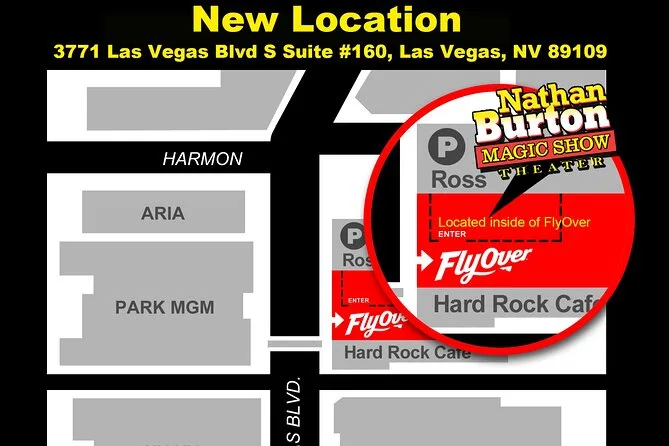 Seu ingresso inclui entrada para o Nathan Burton Comedy Magic Show no novo teatro dentro do FlyOver Las Vegas na Strip — o acesso é fácil, seja a pé ou usando apps como Uber e Lyft. O local é totalmente acessível para cadeirantes e recebe famílias com bebês, carrinhos e animais de serviço.