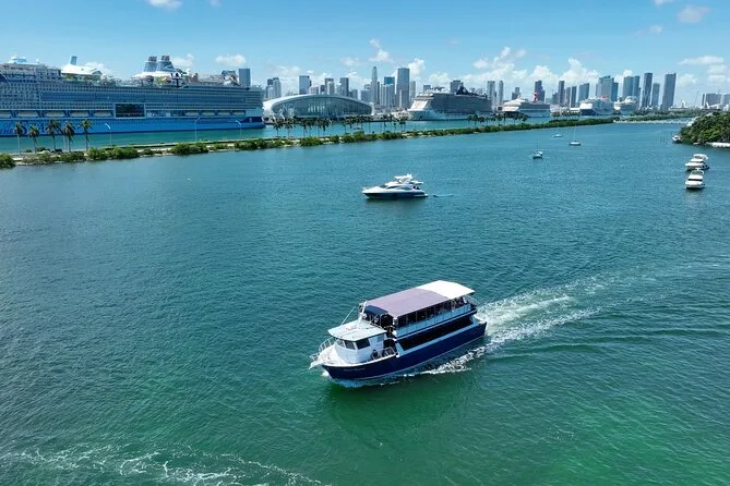 Sua experiência inclui embarque no Bayside Marketplace com guias bilíngues que conduzem o passeio pela Biscayne Bay, passando por pontos como Star Island e Fisher Island. Música ambiente durante o trajeto, com lanches e bebidas à venda; pacotes com Champagne para brindar ao skyline. Banheiros disponíveis para maior conforto durante o passeio.