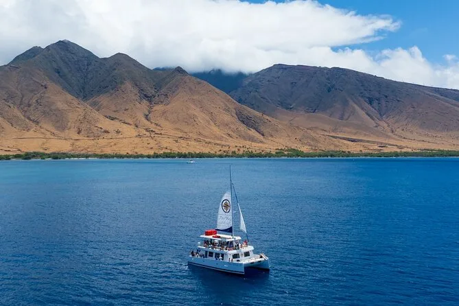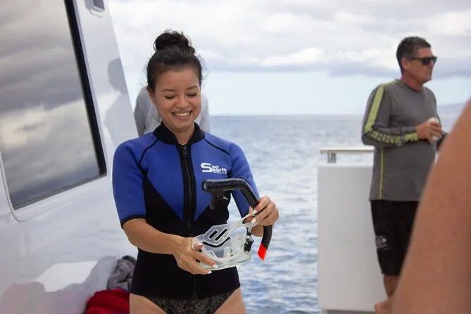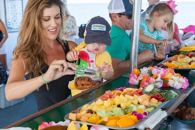 Seu dia inclui check-in no Maalaea Harbor com todo o equipamento de snorkel fornecido (máscaras, nadadeiras, snorkels), cintos de flutuação ou coletes para segurança, pranchas com fundo transparente para mais diversão ou apoio na água, além de café da manhã tropical e almoço reforçado servidos a bordo com bebidas geladas — cerveja e vinho também disponíveis — e a companhia de uma equipe local amigável durante toda a aventura em Molokini antes de voltar para a costa de Maui.