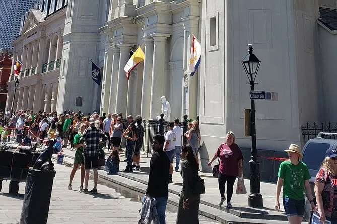 O tour passa pelos principais pontos do French Quarter, incluindo Jackson Square e locais históricos ligados a pandemias.