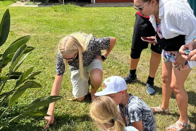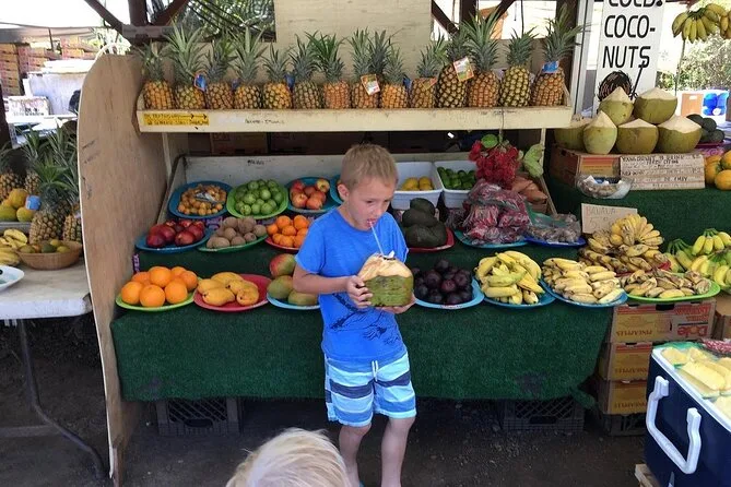O almoço é numa fazenda local com opções como camarão ao alho, camarão com coco, porco kalua e pratos vegetarianos; leve dinheiro para o almoço.