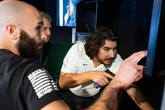 Sua sessão inclui os seis cenários imersivos — estande simulado, desafio de sobrevivência, circuito de competição, invasão domiciliar, tiroteio na rua/diner e missão completa no shopping — com orientação de um instrutor VIP o tempo todo. Depois, você pode relaxar no bar esportivo para comer e conferir seus resultados antes de sair.