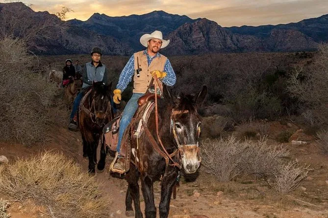 Você vai cavalgar pelo Red Rock Canyon enquanto o pôr do sol pinta os penhascos, guiado por locais que conhecem cada curva da trilha. Veja animais selvagens no caminho antes de se reunir em volta da fogueira para um jantar típico de churrasco western — bife, frango ou salmão — com s’mores de sobremesa sob as estrelas do deserto. Uma mistura perfeita de aventura e descanso.