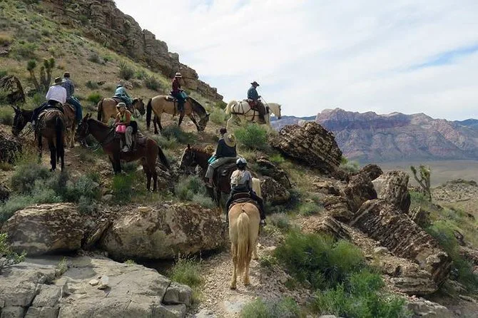 A cavalgada dura cerca de 90 minutos pelas trilhas cênicas do Red Rock Canyon.