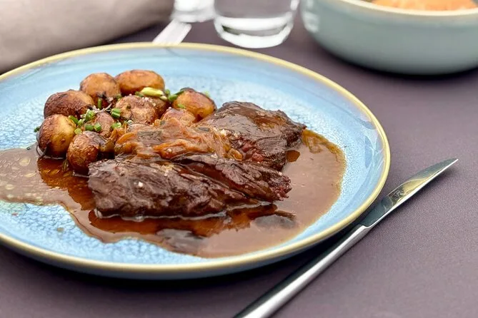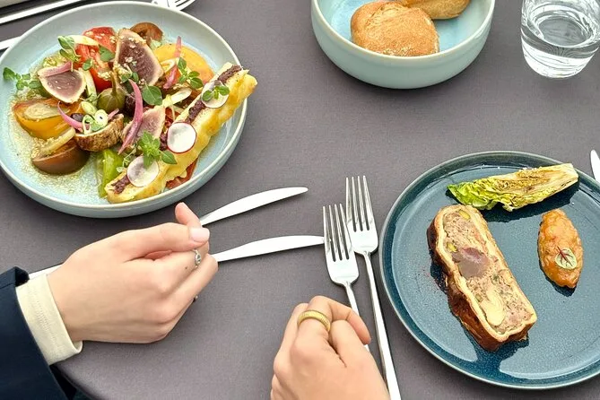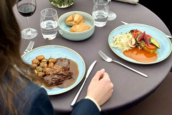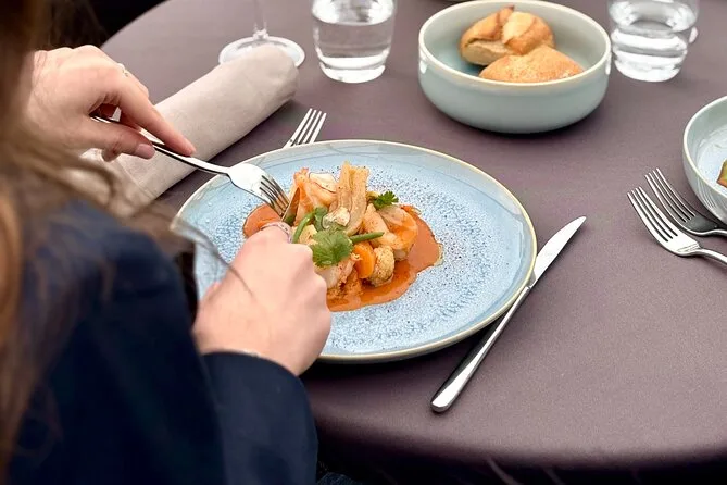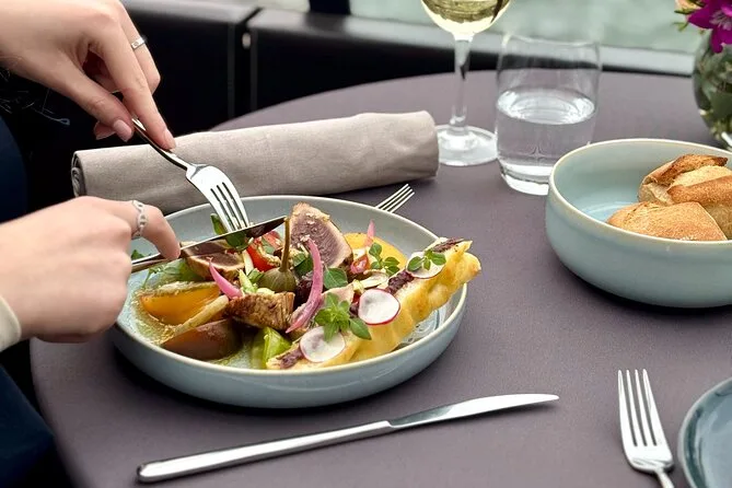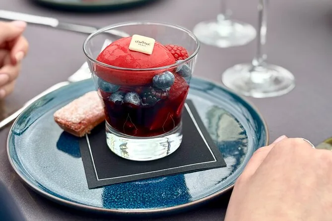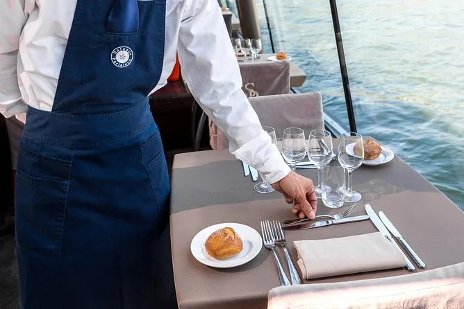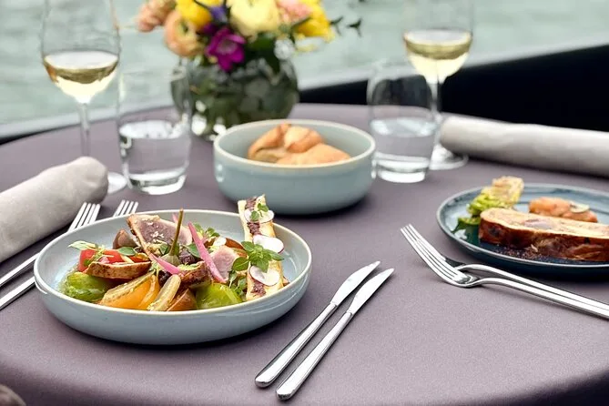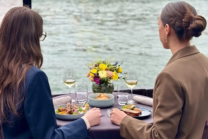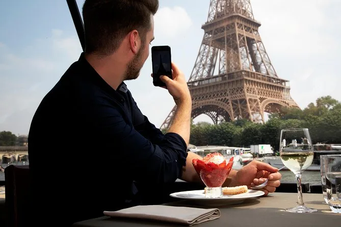 Seu dia inclui um cruzeiro turístico de duas horas saindo perto da Torre Eiffel, em um barco com teto de vidro climatizado e mesa privativa. Você recebe um aperitivo ao embarcar e depois escolhe um menu francês à la carte com três ou quatro pratos (opção vegetariana disponível), vinho para o grupo da mesa, água durante o almoço e café ou chá antes de voltar ao cais — tudo isso enquanto passa por marcos icônicos de Paris às margens do Sena, patrimônio da UNESCO.