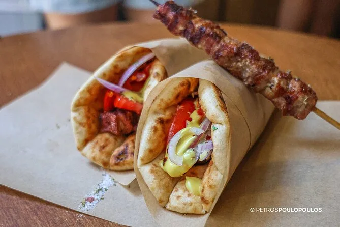 Seu dia inclui degustações de especialidades locais como bougatsa, loukoumades com mel, azeitonas e queijos de lojas selecionadas; entrada no Mercado Varvakeios quando aberto; tudo guiado por um especialista local que compartilha histórias pelo caminho; além de dicas para aproveitar a gastronomia de Atenas — finalizando com souvlaki (carne ou vegetariano) para sair satisfeito e feliz.