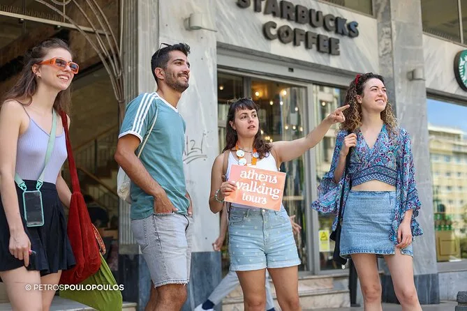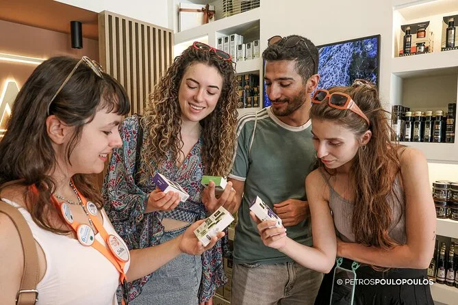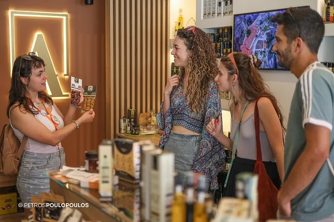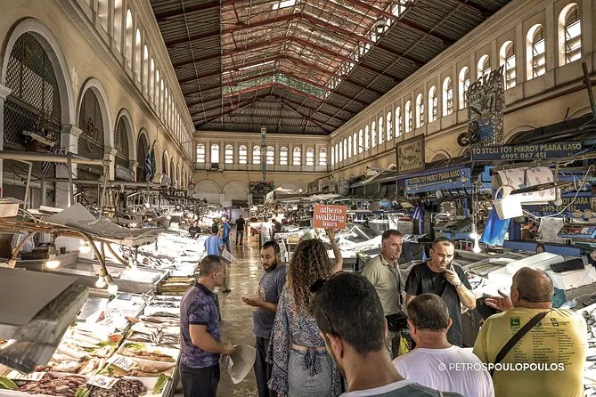 O roteiro passa por Monastiraki, rua Aiolou, lojas especializadas e o Mercado Varvakeios, quando aberto.