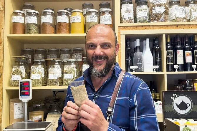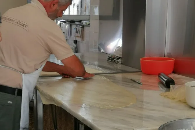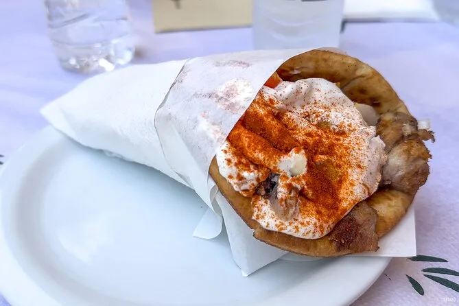 Você vai provar bougatsa, queijos locais, azeitonas, doces cretenses kaltsounia, souvlaki grego autêntico, além de raki e café grego.