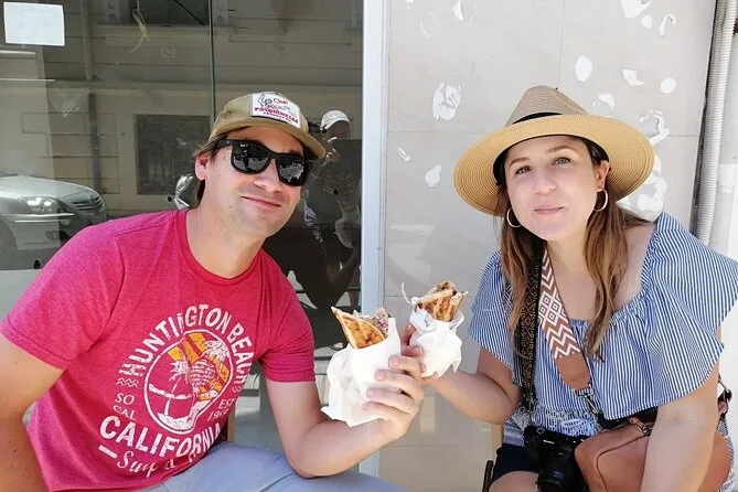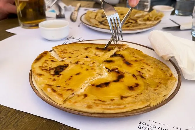 Seu dia inclui caminhadas guiadas pela Cidade Velha de Chania com paradas para provar bougatsa direto da vitrine da padaria, degustações de queijos e azeitonas cretenses acompanhadas de raki em pequenas lojas, café ou chá grego tradicional nos cafés da praça Splatzia, doces kaltsounia e souvlaki autêntico feito na brasa — tudo com um guia local que compartilha histórias a cada passo.