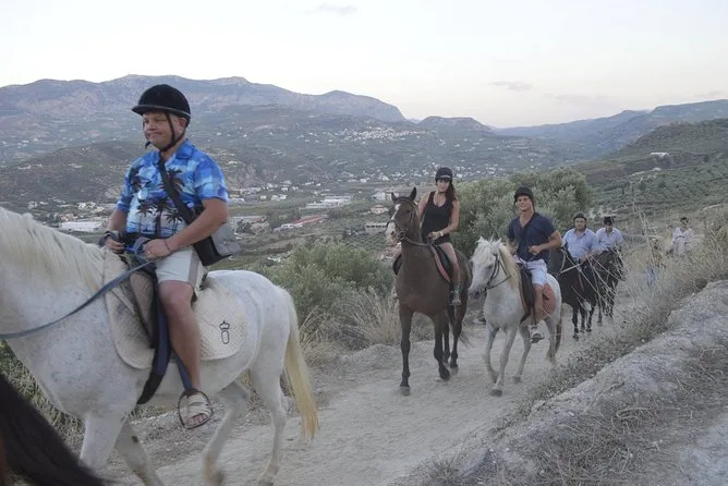 Seu dia inclui transporte de ida e volta (para hotéis selecionados), acompanhamento de um guia local, instrução básica de equitação no estábulo, um passeio tranquilo a cavalo pelas montanhas de Finikia e Giouchtas com paradas para frutas e refrigerantes no topo, seguido de um almoço tradicional cretense com vinho caseiro antes de retornar ao seu hotel.