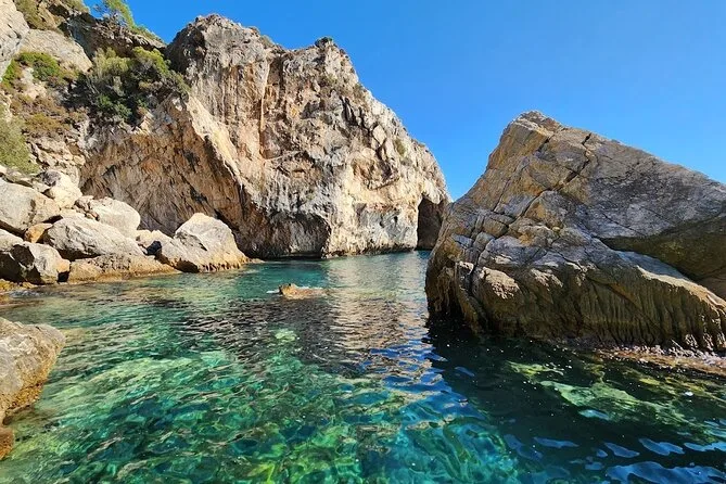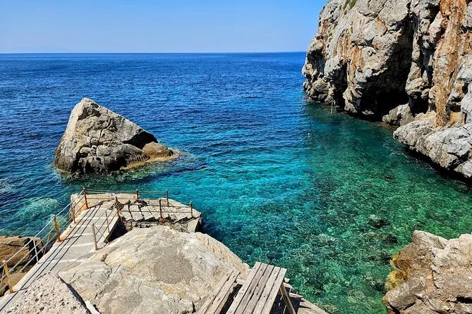 Você vai navegar pela costa norte de Lesvos com um guia local, fazer snorkel num naufrágio real e nadar por cavernas secretas em Kommenos Vrahos. Relaxe nas fontes termais à beira-mar de Panagia Kryfti com petiscos e bebidas a bordo. Um dia para se sentir aventureiro e tranquilo ao mesmo tempo.