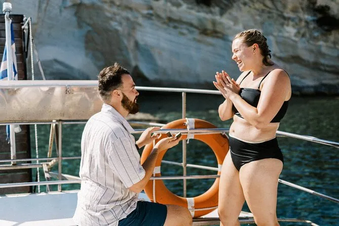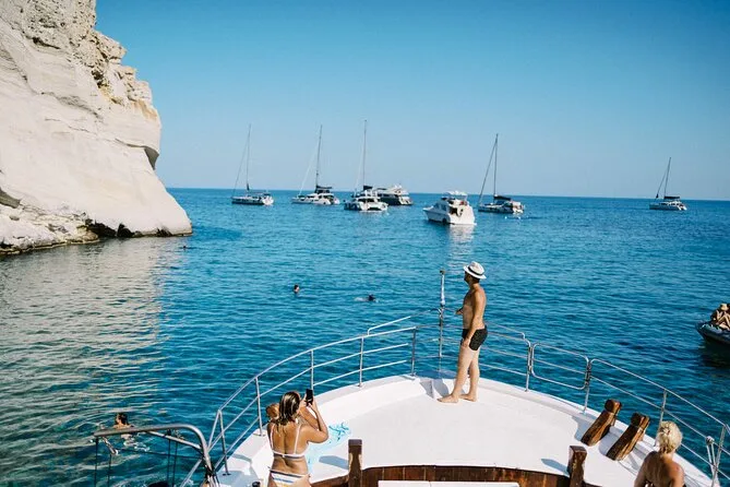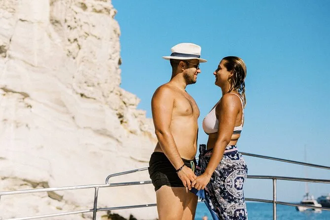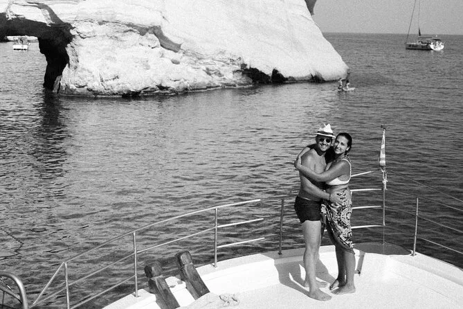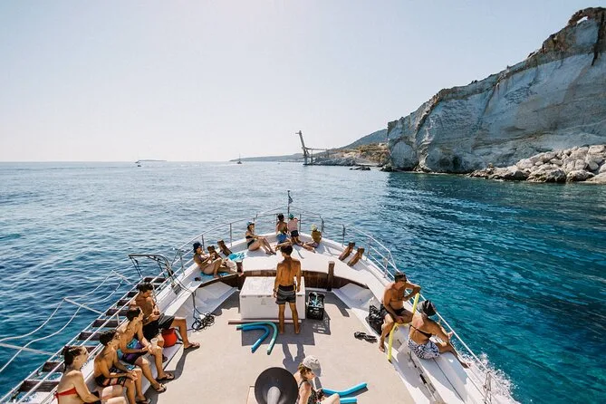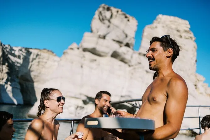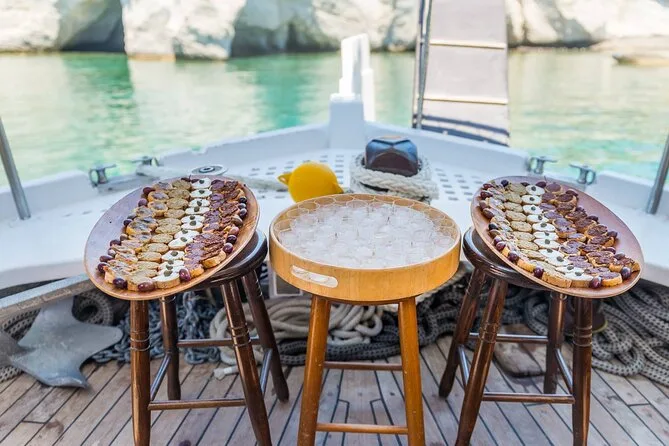 Você vai embarcar num barco clássico de madeira em Agia Kiriaki, navegar pela costa sul de Milos com paradas para nadar na praia de Gerontas e nas cavernas brancas de Kleftiko, e relaxar com petiscos caseiros e bebidas locais no convés. Sinta o sal na pele, prove raki e ouça risadas — esse é o Milos mais verdadeiro.
