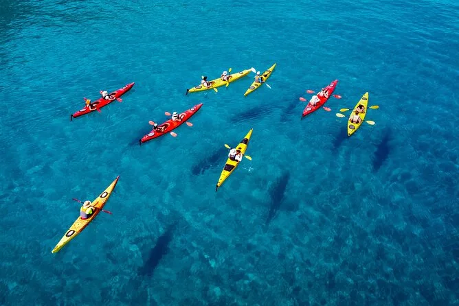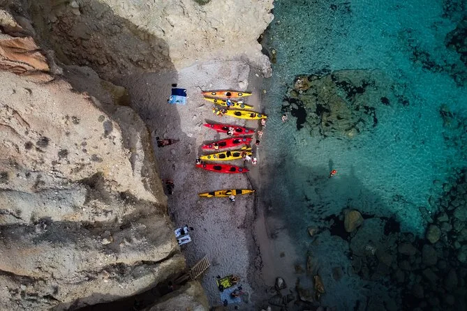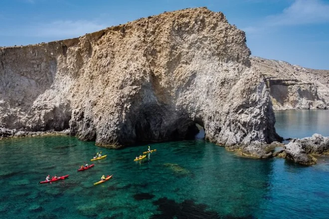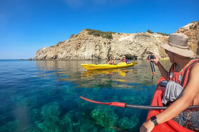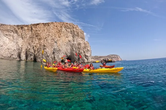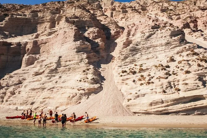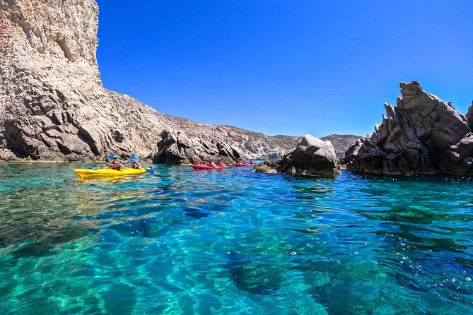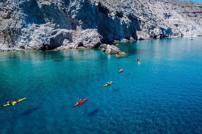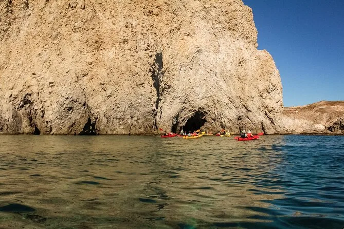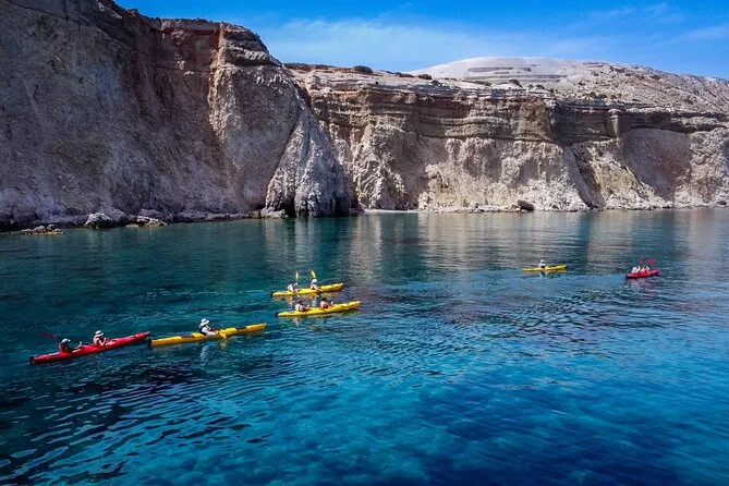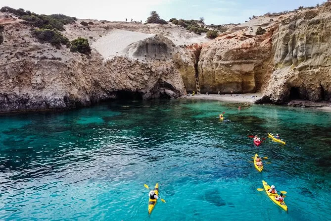 Você vai remar da Praia de Firopotamos pela costa vulcânica de Milos, explorar grutas marinhas de caiaque e fazer snorkel nas fontes termais de Gerakas com um guia local. Prove petiscos caseiros nas pedras e flutue em baías cristalinas. É cabelo salgado, pele aquecida pelo sol e sabores genuínos da Grécia — com muitas risadas pelo caminho.