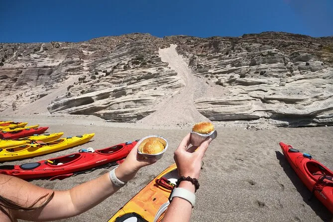 O trecho até a praia de Gerakas demorou mais (meus braços ainda reclamam), mas ver aquelas quedas de areia escorrendo pela rocha vulcânica branca valeu cada esforço. As fontes termais na baía de Gerakas eram discretas — você precisava mexer os dedos na areia para sentir o calorzinho. Ficamos flutuando um tempo, ouvindo a água bater nos caiaques. O almoço foi simples: torta de feta e azeitonas, comemos sentados nas pedras quentes, com o sal ainda secando na pele. Nada sofisticado, mas perfeito depois de tanto remar.