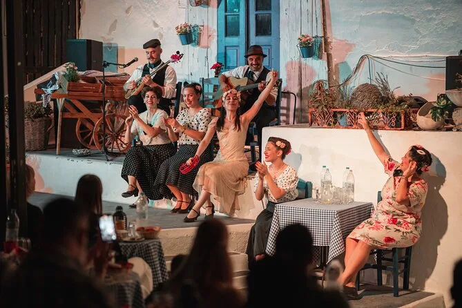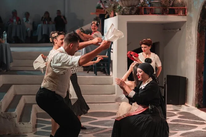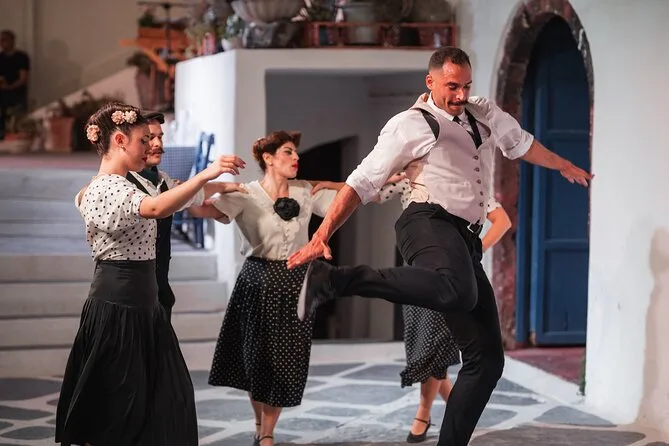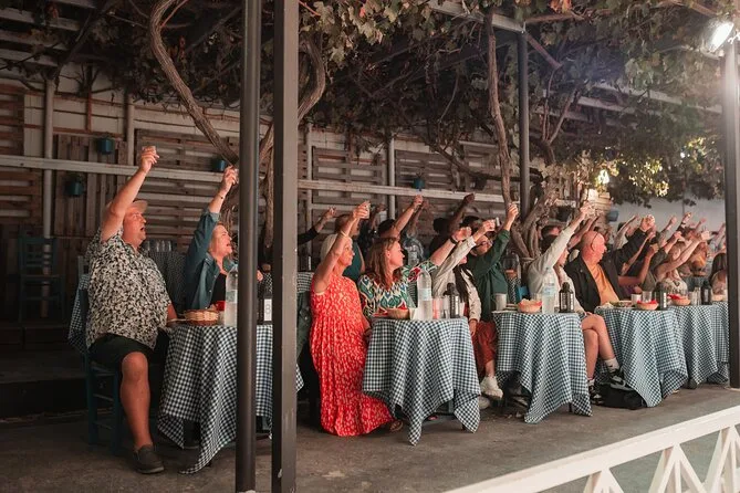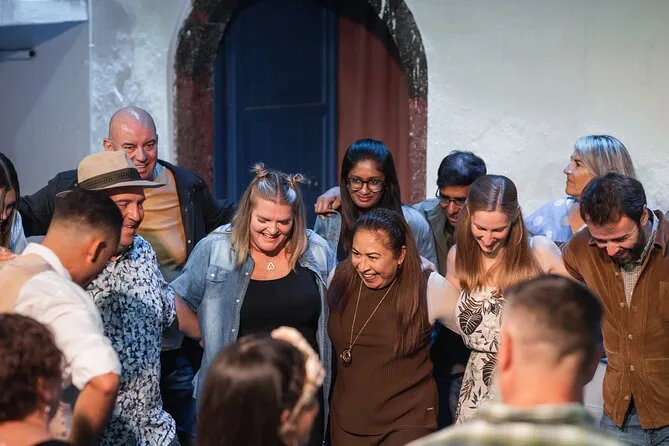 Você vai entrar de cabeça numa festa de casamento grega em Santorini—dançando ao som de música ao vivo sob o céu aberto, aprendendo passos de Zorba com os locais, quebrando pratos com novos amigos e saboreando petiscos meze na sua mesa. Risadas, vinho local e momentos que ficam na memória muito depois da última música.