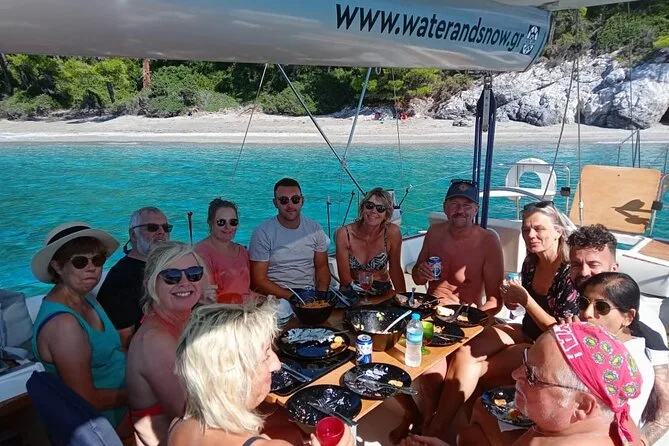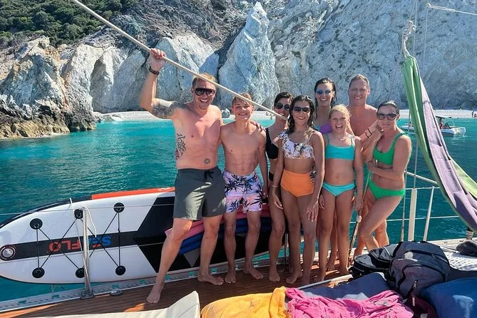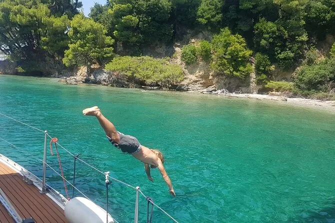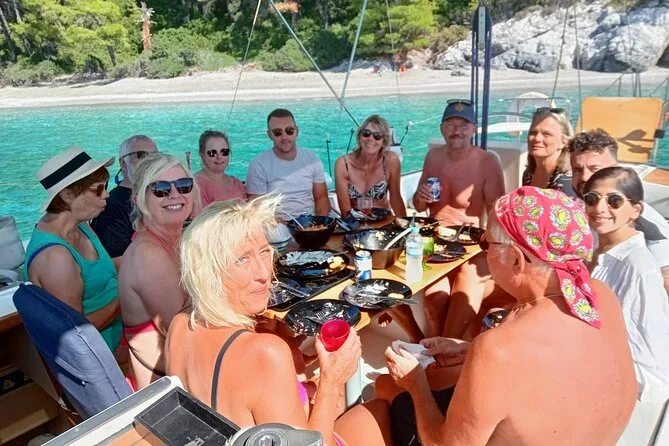 Seu dia inclui café da manhã com doce ao zarpar do porto de Skiathos, todo o equipamento para snorkel e stand-up paddle para as paradas em Tsougria e nas enseadas de Skopelos, além do almoço fresco feito a bordo com vinho ou cerveja. Bebidas geladas são servidas o dia todo, junto com salada de frutas à tarde, antes do retorno ao porto no fim do dia.