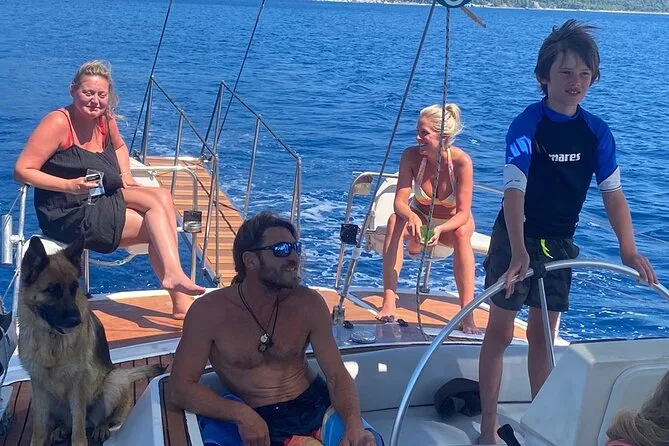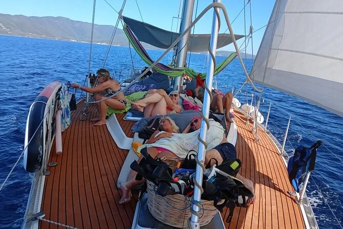 Ainda lembro da primeira vez que vi o Rainbow balançando no porto de Skiathos — pintura vibrante, o sol já brilhando na água, e a Naya, a pastor alemão, abanando o rabo como se já nos conhecesse. Era uma mistura de empolgação com aquela calma estranha que bate antes de algo especial começar. Nosso guia, Yiannis, distribuiu café e um bolinho (acho que era de laranja? Nunca tive certeza) enquanto zarparmos. O motor desligou e de repente só havia o vento e o som das cordas rangendo. Nunca tinha percebido o quão azul a água podia ser até chegarmos à Ilha Tsougria para o primeiro mergulho — parecia que alguém tinha aumentado as cores.