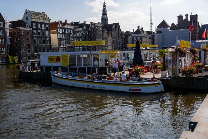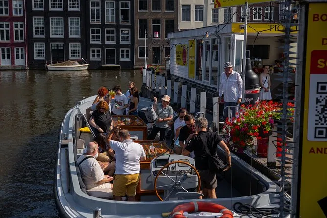 Seu dia inclui um lugar em um barco aberto estiloso pelos canais de Amsterdam com um capitão que fala inglês e holandês, guiando você em cada curva; há banheiro disponível no píer antes da saída e você pode comprar bebidas ou lanches na loja se quiser algo antes de partir.