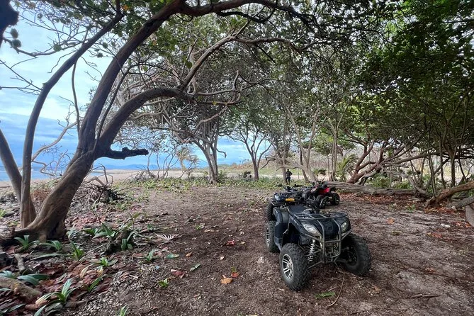 Depois dos cavalos, vieram os ATVs, que foram bem mais intensos do que eu esperava. Uma rápida explicação de segurança (Luis é super rigoroso com capacetes), e lá fomos nós — motores roncando, lama espirrando nas minhas calças quase que imediatamente. A selva aqui é densa e barulhenta; pássaros gritando lá em cima, algo mexendo no mato a cada poucos minutos. Em um momento, paramos numa costa de pedra onde iguanas negras tomavam sol como pequenos dinossauros. A vista do mar simplesmente se abriu do nada — nem tentei tirar foto, parecia melhor só ficar ali um instante.