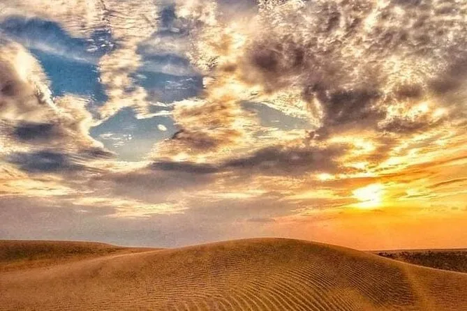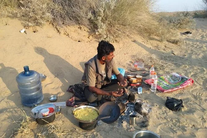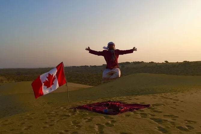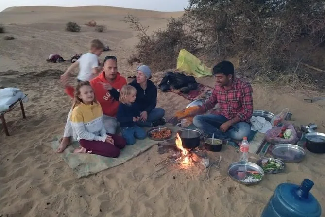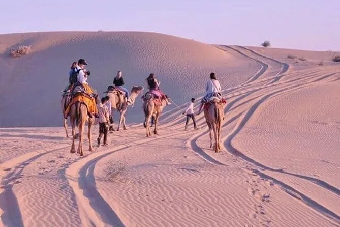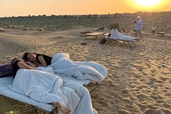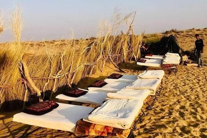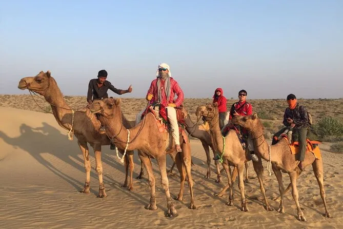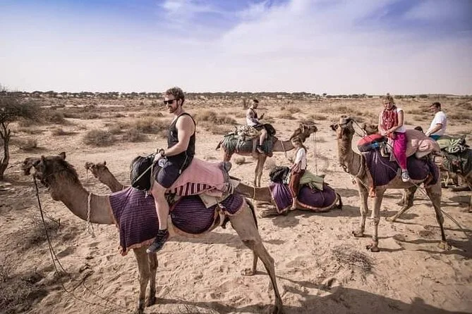 Seu safari de camelo com pernoite inclui todas as refeições (jantar e café da manhã), água mineral, transfers de jeep entre Jaisalmer e os pontos no deserto, seu próprio camelo para ir até o acampamento, roupa de cama limpa (colchão e cobertores) nas dunas sob o céu aberto — e espaço para guardar sua bagagem, além de chuveiros quando você voltar.
