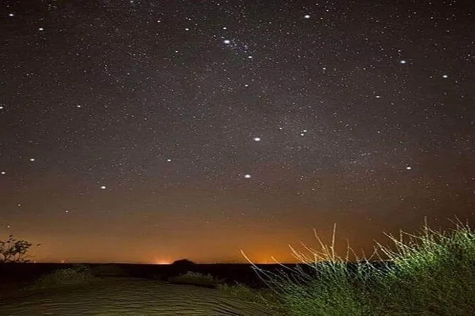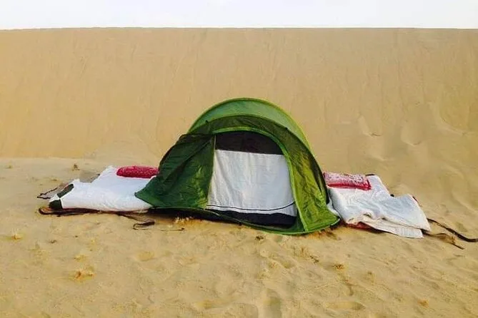 Dormir sob as estrelas aqui é outra experiência — não tem nenhuma luz de cidade por perto. Montaram colchões grossos e mais cobertores do que eu imaginava que precisaria (a noite esfria rápido). Acordei uma vez só para ouvir o vento mexendo na areia ao nosso redor.