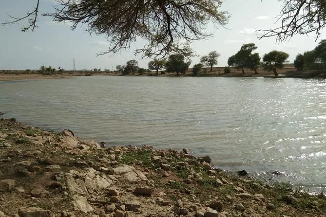 O ar do deserto é diferente assim que você deixa Jaisalmer para trás. Por volta das 15h, embarcamos numa velha jeep — janelas abertas, cabelo cheio de areia — e seguimos rumo ao Thar. A primeira parada foi Jassery, um lago pequeno e estranho feito pelo homem, onde os pastores levam suas cabras para beber. O silêncio só é quebrado pelo vento e pelo ocasional splash da água. Nosso guia, Salim, mostrou como a água mantém a região verde, mesmo quando tudo ao redor parece seco e queimado pelo sol.