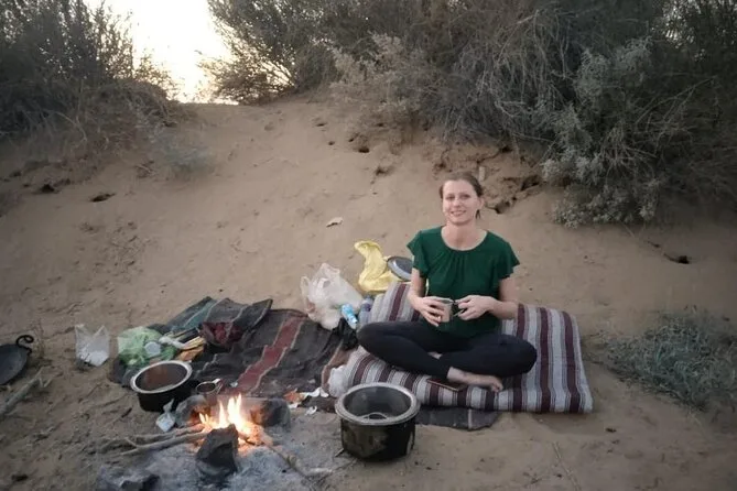 O amanhecer chega cedo no deserto. Alguém me entregou chá antes mesmo de eu me sentar direito; logo depois veio torrada com manteiga e frutas. Ver o sol nascer do topo de uma duna, com um chai quentinho na mão, parecia apertar o pause na vida por um instante. Às 10h já estávamos de volta à cidade — com poeira, cansados, mas com vontade de repetir tudo de novo.
