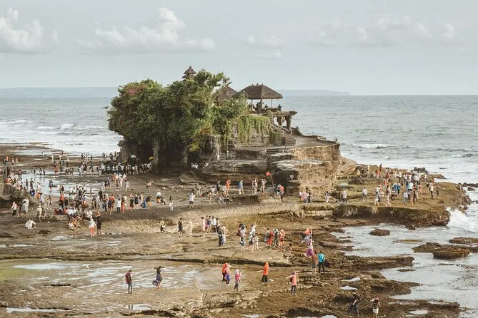 Encerramos em Tanah Lot pouco antes do pôr do sol. O templo fica sobre uma rocha no mar — você ouve as ondas batendo embaixo e às vezes sente o cheiro de milho assado dos vendedores próximos. Quando a maré sobe, realmente parece que ele está flutuando. Havia mais gente, mas todos pareciam parar para admirar o céu laranja atrás da silhueta do templo. É daquelas cenas que ficam na memória.